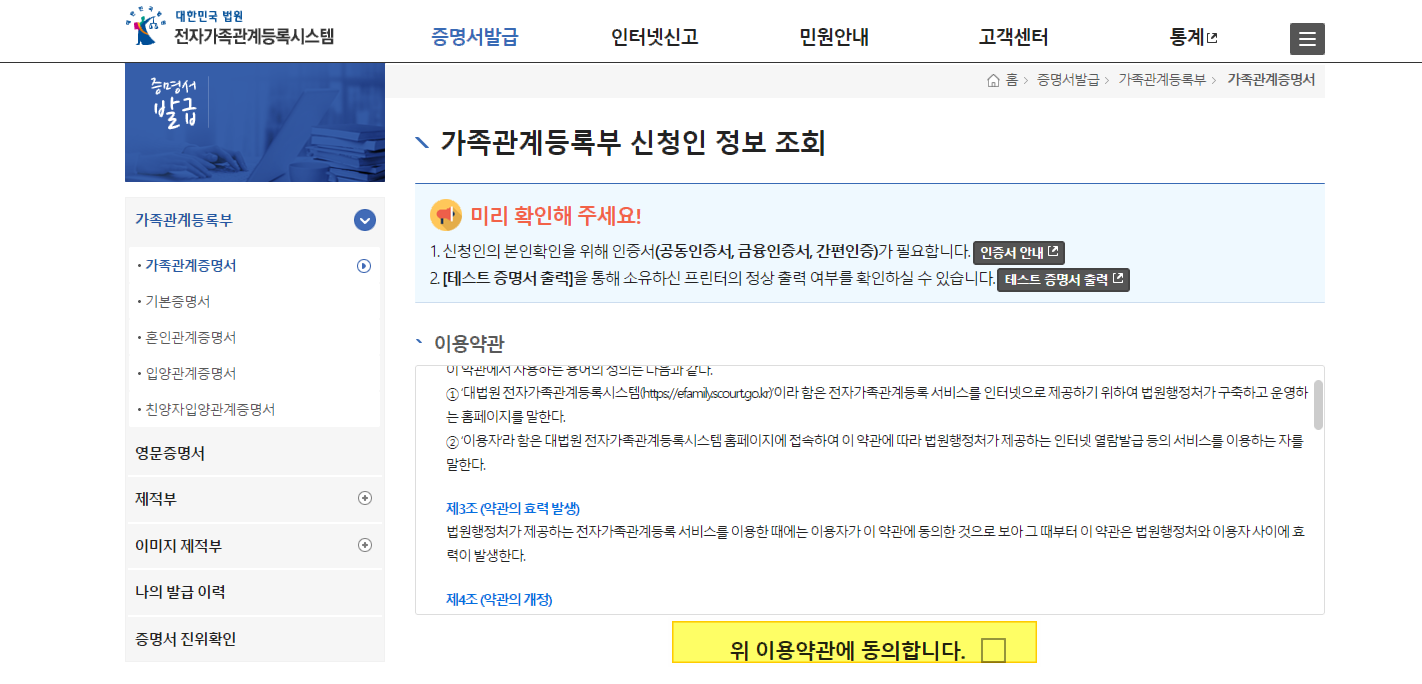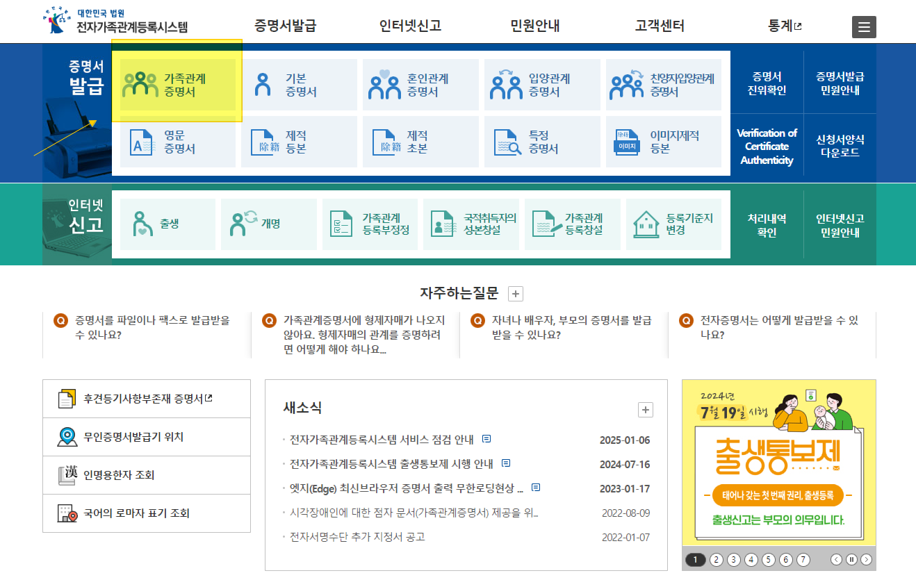 - 사이트 내에서 가족관계증명서 발급 메뉴를 선택합니다.